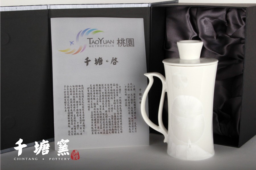 導入負離子材料,讓喝茶喝酒口感更升級。千塘啟,以桃園千塘之鄉命名,桃園機場為台灣國際大門入口,鳥把造型象徵開啟國家大門,杯蓋如同燈塔,照亮台灣,引領世界。